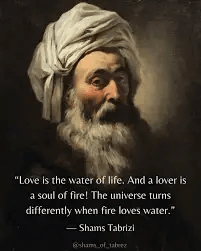 “One day Rumi was reading next to a large stack of books. Shams Tabriz, passing by, asked him, “What are you doing?” Rumi replied scoffing, “Something you cannot understand.” (This is knowledge that cannot be understood by the unlearned.) On hearing this, Shams threw the stack of books into a nearby pool of water. Rumi hastily rescued the books and to his surprise they were all dry. Rumi then asked Shams, “What is this?” To which Shams replied, “Mowlana, this is what you cannot understand.” (This is knowledge that cannot be understood by the learned.)”.
